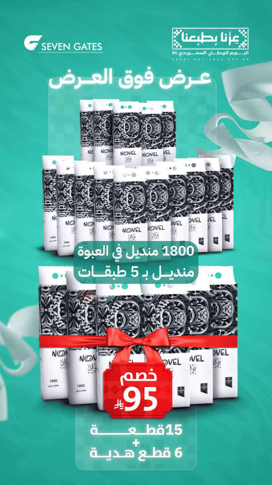 بكج اليوم الوطني 15 عبوة مناديل 1800 + 6 عبوات هدية مع خصم 95 ريال